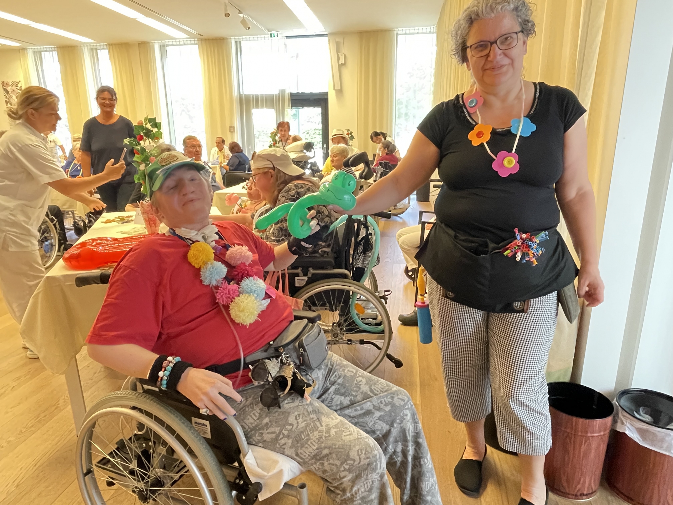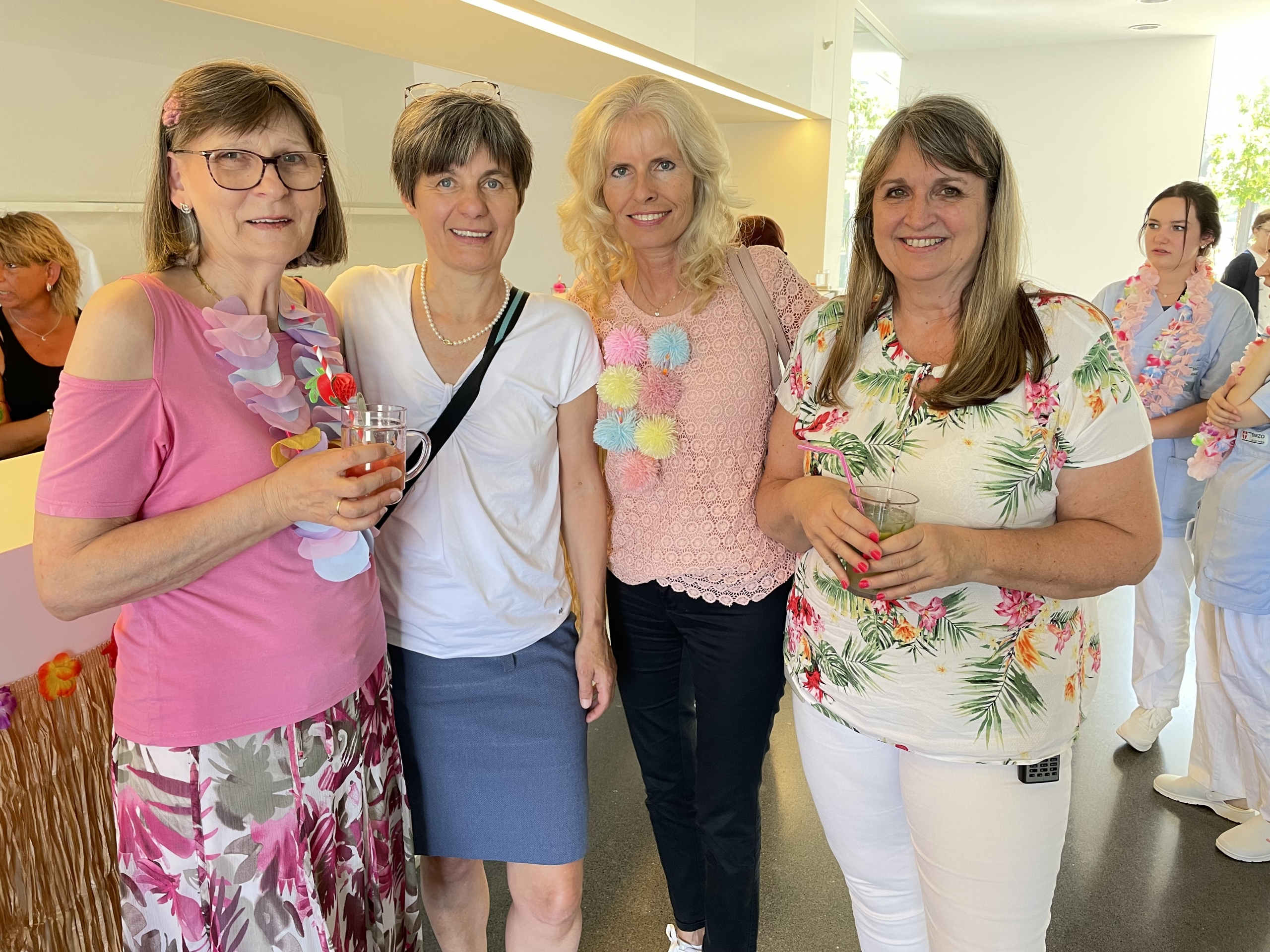 Darauf hatten alle sehnsüchtig gewartet: Endlich wieder ein Fest ohne Einschränkungen. Unter dem Motto Urlaub auf Hawaii organisierten die Mitarbeiter*innen der Pflege Donaustadt (PDO) in der ersten Juni-Woche das kunterbunt geschmückte Sommerfest im Festsaal und auf dem Vorplatz des Hauses. Die dazu passenden Girlanden und Blumenketten hatten in den Tagen zuvor fleißige Bewohner*innen mit Unterstützung der PDO-Mitarbeiter*innen gebastelt. Maria Gessert, die Leiterin der Pflegedienste in der PDO, eröffnete die Hawaii-Party. Und kaum spielte der Musiker die ersten Hits und Evergreens, wagten sich schon die Tänzer*innen auf das Tanzparkett.